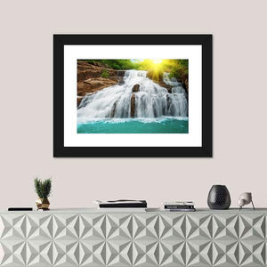 This vibrant canvas artwork captures a serene waterfall cascading over rocks, surrounded by lush trees. Sunlight streams through the foliage, illuminating a turquoise pool at the base, creating a natural and inviting atmosphere.