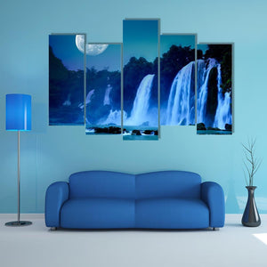 Waterfall Under Moonlight Canvas shows a waterfall beneath a full moon and night sky, rendered in cool blue, white, green, and black tones. The split composition and rule-of-thirds placement create a calm, majestic mood that suits modern home interiors and room decor.