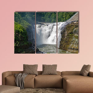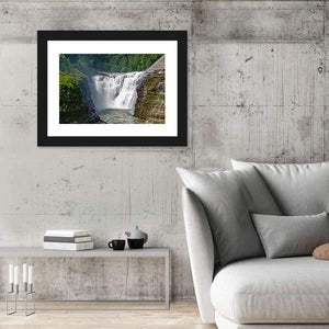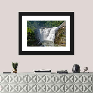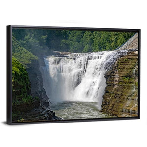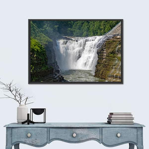 A realistic landscape of the waterfalls at Letchworth State Park in New York, featuring a river framed by cliffs, layered rock formations, and mist rising from the falls. The composition uses depth and the rule of thirds with a green, brown, white and blue palette to create a peaceful, majestic, and serene atmosphere that works well in modern home decor and living spaces.