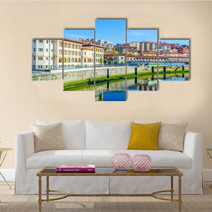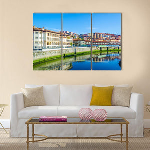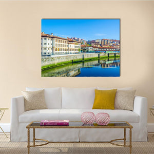 A realistic cityscape of the Nervion River waterfront, showing buildings, a bridge and reflections on the water. The rule-of-thirds composition and blue, white, green and orange palette give a bright, serene urban mood. Suited for modern living rooms or office walls as a calm focal piece.