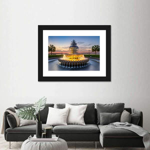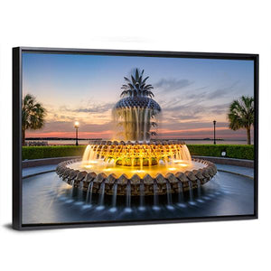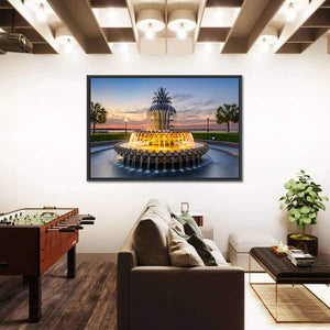 A realistic canvas print of the Pineapple Fountain at Waterfront Park in Charleston, showing the illuminated, pineapple-shaped fountain and surrounding palm trees at sunset. The symmetrical composition and twilight palette of blues, oranges, and yellows creates a tranquil, scenic mood that suits coastal or modern room decor.