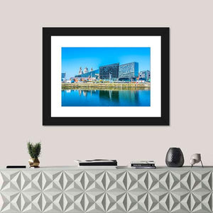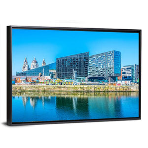 Waterside of Liverpool captures a waterfront cityscape with historic domes and glass-fronted modern buildings reflecting on the water. The blue, white, gray and green palette creates a calm, urban mood. This modern city print works well as room decor in a living room or home office.