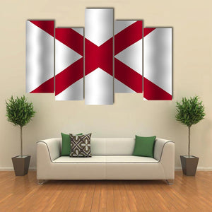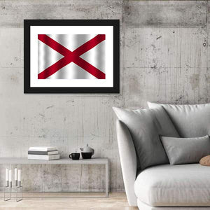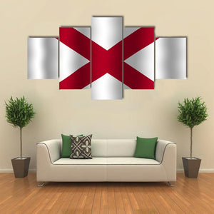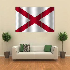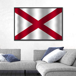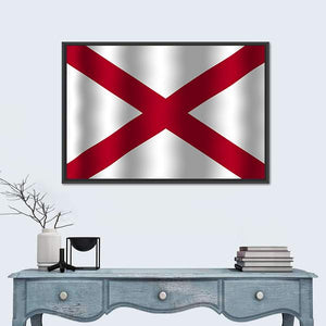 This canvas depicts the Alabama state flag in a bold, graphic style that leans on symmetry and a red-and-white palette. The simple, modern look suits contemporary home and room decor where a clear, graphic statement is wanted.