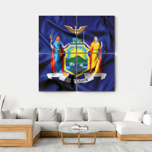 This canvas art features the proud Waving Flag of New York, complete with the iconic state seal and the word 'Excelsior.' Its vibrant palette of blue, gold, green, red, and white creates a formal atmosphere, making it a striking addition to any space.