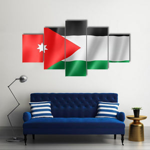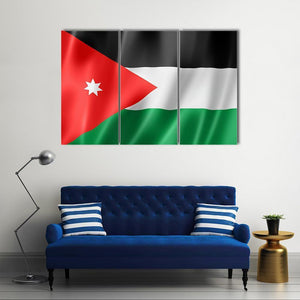 Waving Jordan Flag Canvas captures the Jordan flag in motion with the seven-pointed star placed using a rule-of-thirds composition. The black, white, red, and green palette creates a bold, patriotic mood that fits modern home and room decor.