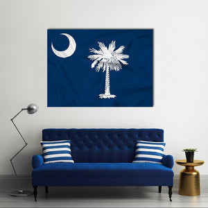 This centered, modern canvas features the South Carolina state flag with the palmetto tree and crescent moon in a clean blue-and-white palette. Its proud, patriotic mood and minimalist graphic look suit modern home decor and room displays.