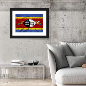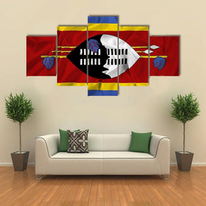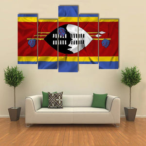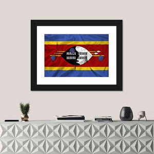 Waving Swaziland Flag Canvas Wall Art features the Swaziland national flag rendered in bold red, blue, yellow, black and white with a wrinkled-texture effect that suggests motion. The symmetrical composition centers the shield emblem and crossed spears for a striking, patriotic look in a modern style. It fits well in modern homes and colorful room decor.