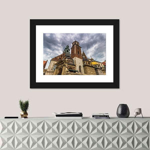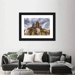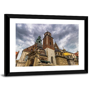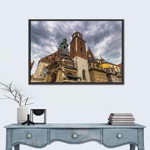 Photorealistic canvas of Wawel Cathedral in Krakow, shown from a low-angle, dramatic perspective. Stormy clouds, stone facades, domes and a tall steeple create a grand, overcast mood that fits both modern and historic interiors.