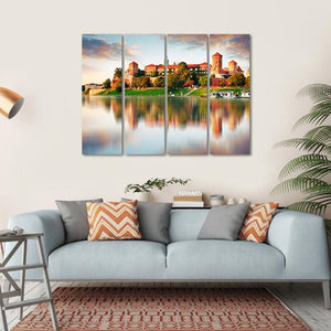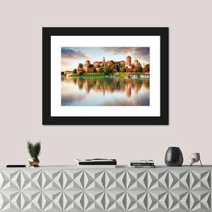 Capture the serene beauty of Wawel Hill with this canvas wall art featuring a majestic castle. The calming reflections of the river, framed by lush trees and a vibrant sky, create a tranquil atmosphere in any space.