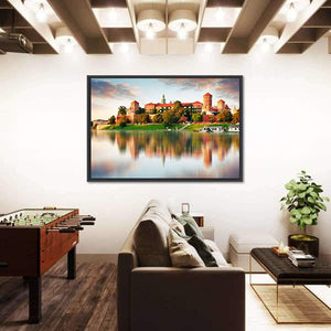 Wawel Hill With Castle In Pink Light shows a castle by a river at sunset, trees and a soft pink sky mirrored in the water. The scene feels peaceful, serene and majestic, making a calm focal point for modern room decor.