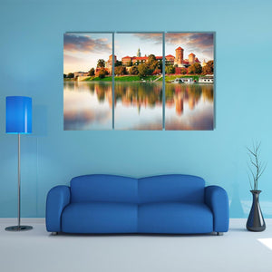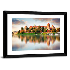 This canvas showcases a picturesque landscape featuring a serene castle on Wawel Hill, reflected in calm waters. The vibrant palette of reds, greens, and blues brings tranquility to any space.