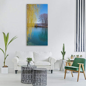 A realistic landscape of a weeping willow beside a calm river in a spring pasture, painted in soft blues, greens, yellows and brown. The scene feels peaceful and natural, with the willow reflected in the water and bare branches on distant trees. Works well in modern or nature-inspired room decor.