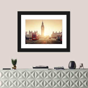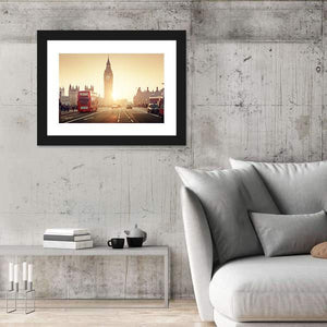 Experience the vibrant beauty of London with this nostalgic cityscape featuring Big Ben and a classic red double-decker bus. The warm hues of sunrise and sunset create a bustling atmosphere that showcases this iconic landmark.