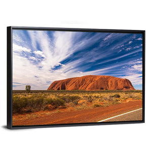 A photographic canvas of Uluru (Ayers Rock) set beneath wispy white clouds. Red rock, a desert road and open sky create a vast, serene, arid mood that works well in modern living rooms or home offices.