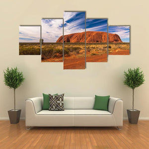 White Clouds Over Ayers Rock captures Uluru (Ayers Rock) and the surrounding desert beneath streaky white clouds. A wide-angle, low-angle view leads the eye along a red dirt road and sparse vegetation, creating a vast, scenic, natural mood. It complements modern interiors and room decor that favor warm, natural colors.