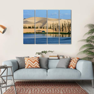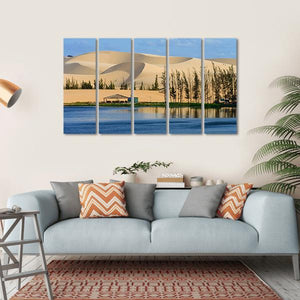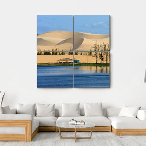 Capture the serene beauty of Mui Ne, Vietnam with this canvas wall art featuring rolling sand dunes, a tranquil lake, and tall trees. The calming palette of blue, tan, and white creates a peaceful atmosphere, making it a delightful addition to your home decor.