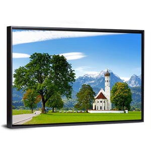 This canvas shows the White St. Coloman pilgrimage church with its tall steeple set among mountains, trees and a quiet road. A realistic composition and a cool palette of green, blue, white and brown create a serene, picturesque mood that suits modern home decor and calm living spaces.