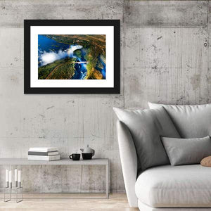 Experience the breathtaking beauty of Victoria Falls with this stunning watercolor of its wide expanse from the air. The vibrant blues and greens capture the majesty of the waterfall, complemented by the serene mist and an arch bridge spanning the river below.