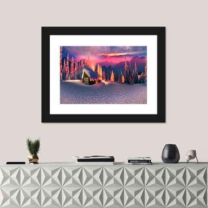 This canvas shows a snow-covered cabin among pine trees beneath a night sky. Purple and pink aurora-like light and fireworks mix with warm window light to create a magical, festive, and serene scene. Works well in living rooms, bedrooms, or nature-themed spaces.