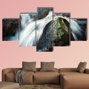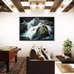 This nature photograph captures a waterfall and river flowing between dark, wet rocks, shot with a long exposure for a smooth water effect. Cool blues, whites and grays give the scene a serene yet powerful mood that pairs well with modern home and room decor.
