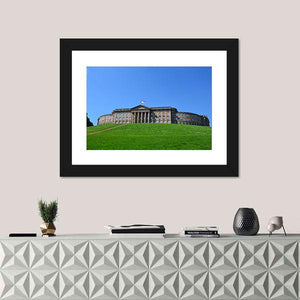 Wilhelmshoehe Castle Park in Kassel shows a historic castle atop a grassy hill under a clear blue sky. The wide panoramic print highlights classical columns and a flag in a realistic style, offering a grand, stately, and serene atmosphere. It pairs well with classic or modern room decor as a calm focal point.