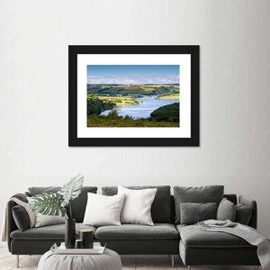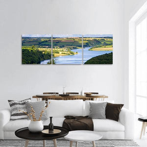 This panoramic canvas of Wimbleball Lake in England captures a river winding through patchwork fields, rolling hills and scattered trees in a peaceful, photorealistic scene. Sunlight reflecting on the water and a blue-green summer palette give the print a serene, natural atmosphere that suits modern living spaces and nature-inspired rooms.