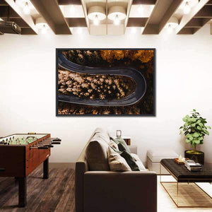 Discover the serene beauty of a curving road through autumnal foliage in the mountains. This canvas art captures the natural essence of vibrant greens and earthy browns, inviting a peaceful atmosphere into your space.