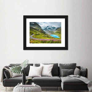 Experience the beauty of nature with this canvas art featuring a winding mountain road. Lush green landscapes and vibrant wildflowers lead to a serene lake, all set against dramatic snow-capped peaks. It's a scenic addition to any room.
