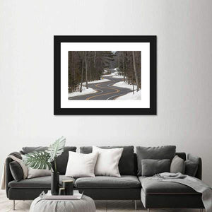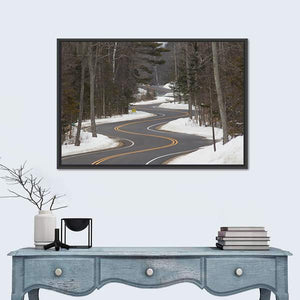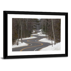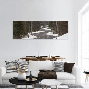 Winding Road in Wisconsin captures a quiet, snowy forest road with bare trees and yellow road markings, conveying a serene, isolated winter scene. The realistic panoramic composition and curving lines draw the eye across the landscape. Suits modern or nature-inspired interiors.