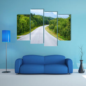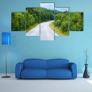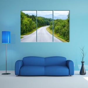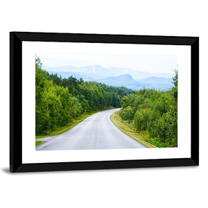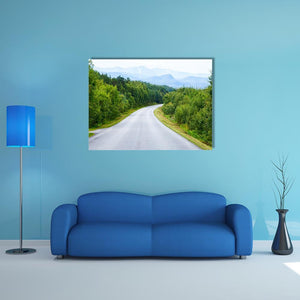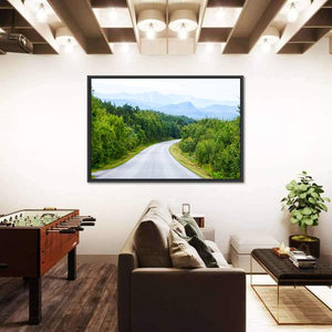 This captivating canvas features a winding road surrounded by lush green trees and distant mountains. The serene atmosphere invites a sense of peace, making it an ideal addition to any space looking to embrace nature's beauty.
