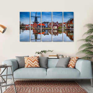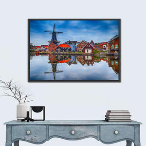 This serene canvas art captures a traditional Dutch windmill alongside charming houses with red roofs, all reflected in calm water. Perfect for adding a picturesque touch to your home décor.