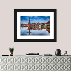 This canvas depicts a traditional Dutch windmill and colorful houses along a calm canal in Haarlem. The realistic landscape captures reflections on the water and a serene, picturesque mood, making it a quiet, scenic addition to modern room decor.