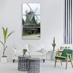 Windmill In Denmark presents a realistic, vintage landscape centered on a weathered windmill with trees and a muted green-and-gray sky. The scene feels traditional and rustic, with weathered sails and pebbled ground—suitable for farmhouse or country-style rooms.