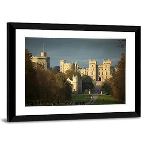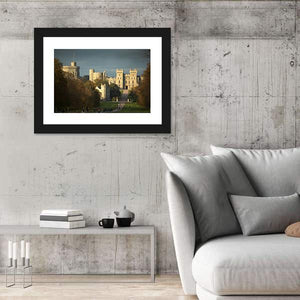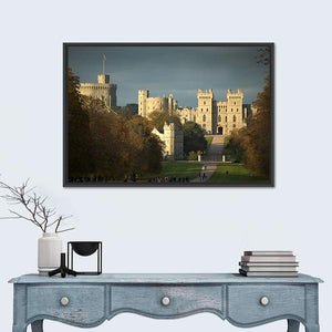 This canvas art beautifully captures the historic Windsor Castle, surrounded by serene trees and autumn foliage. The majestic scene, featuring a flag atop the castle, invites tranquility into any space.