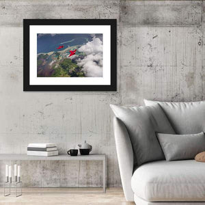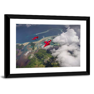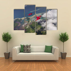 This canvas wall art captures a breathtaking aerial view of wingsuiters soaring over the stunning coastline of Palau. The vibrant palette of red, blue, and green evokes a sense of adventure and excitement, making it a striking addition to any modern decor.