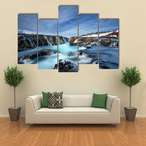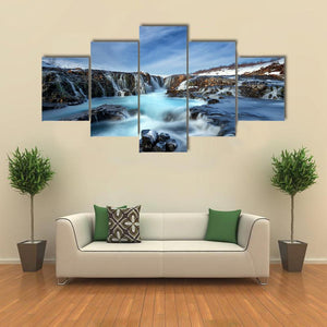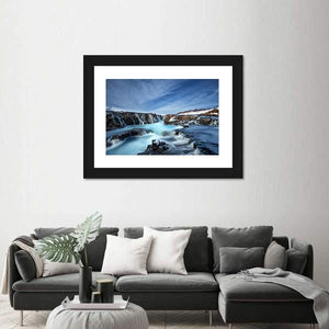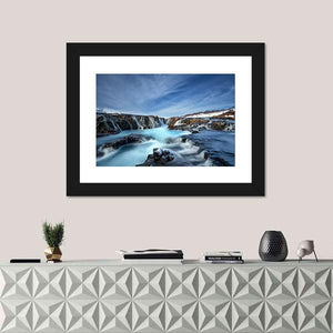Winter Day at Bruarfoss captures a riverside waterfall with icy, partially snow-covered rocks. The long-exposure nature photograph softens the flowing water and creates a serene, cold, majestic atmosphere. Its blue, white, grey palette and nature-photography style fits modern homes and room decor like living rooms or hallways.