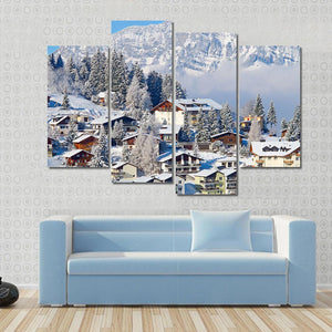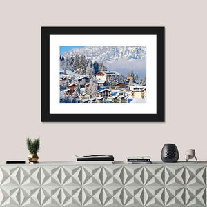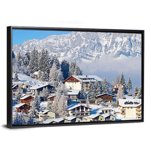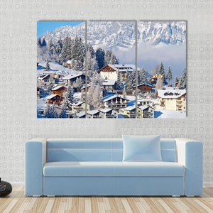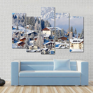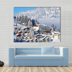 This canvas art captures a serene winter scene of a snowy mountain village in the Swiss Alps. Featuring rustic alpine houses with steeply sloped roofs and snow-covered pine trees, it brings a cozy, picturesque feeling to any space.