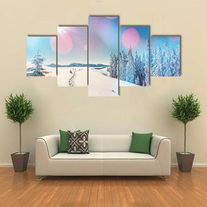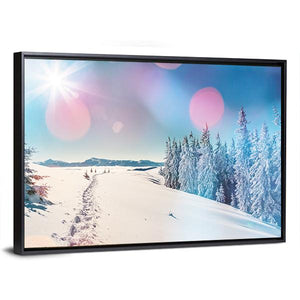 This canvas art captures a peaceful winter scene, featuring a snowy path lined with pine trees. The bright blue and white palette, accented by soft pinks and greens, evokes a serene atmosphere perfect for any room.