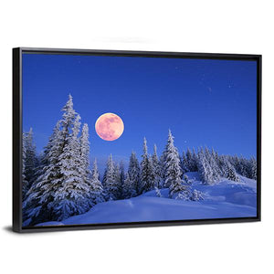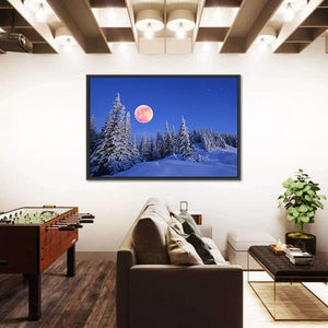Bring the tranquility of a snowy forest into your home with this Winter Landscape in the Mountains canvas art. The serene scene features a beautiful pink moon illuminating snow-covered trees under a starry night sky, evoking a magical and cold atmosphere. This piece is well-suited for creating a peaceful ambiance in any room.