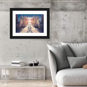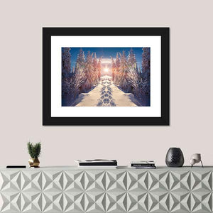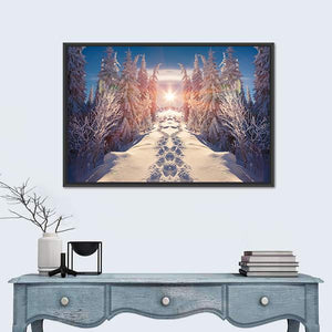 A winter landscape that centers on a snowy path lined by winter trees beneath a starburst sun, rendered in soft blues, whites, pinks, and yellows. The calm, symmetrical composition with footprints in the snow creates a serene, peaceful, and bright atmosphere that suits modern, nature-inspired rooms.