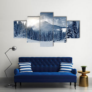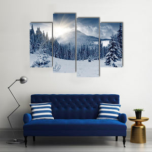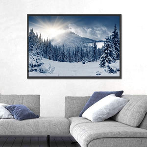 Snow-covered trees and a distant snowy mountain sit beneath sunbeams breaking through clouds, rendered in cool blues, whites, grays and blacks. The composition emphasizes depth and a serene, bright, cold mood, making the piece well suited to modern living rooms or nature-themed spaces.