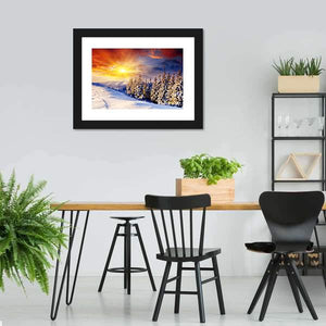 Snow-covered pine trees stand beneath a mountain sunset, with sun rays breaking through the clouds to create a dramatic, serene scene. This realistic landscape suits modern spaces and nature-inspired décor.