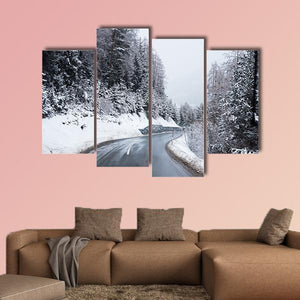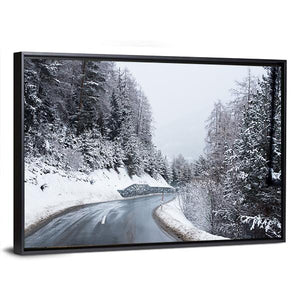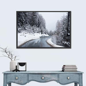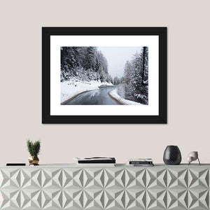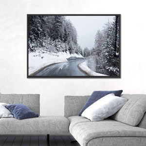 Winter Road Through Icy Forest depicts a wet asphalt road leading into snow-covered trees with a low rock retaining wall. The realistic landscape uses muted grays, whites, blacks and hints of green to create a wintry, serene and quietly isolating mood. Suited to modern, nature-inspired room decor, it pairs well with minimalist interiors.