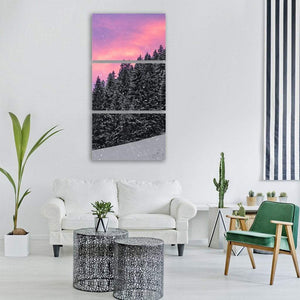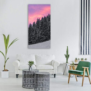 A snowy forest beneath a pink-and-purple twilight sky, scattered with stars and soft falling snow. Composed with the rule of thirds and a modern color palette of pink, purple, white, and black, it brings a peaceful, serene, slightly magical mood that suits modern living rooms or bedrooms.