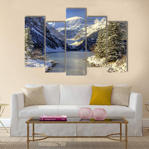 Snow on Lake Louise shows snow-capped mountains, a clear blue sky, and a frozen shoreline beside a still lake. Sunlight hits the peaks and pine trees frame the view, creating a serene, majestic winter atmosphere in realistic blues, whites, greens, and browns. Suits nature-inspired or modern home decor as a calm focal wall piece.