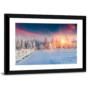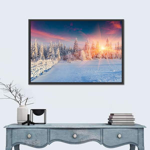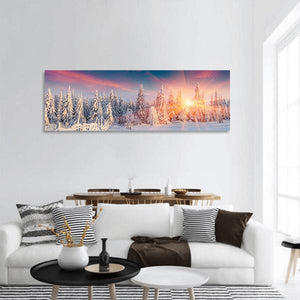 A panoramic canvas of the Carpathian winter forest, featuring snowy trees and a warm sunburst at sunset. Soft pink, blue and orange tones create a serene, peaceful mood that suits modern or nature‑inspired rooms.