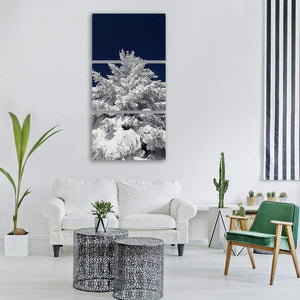 Snow-covered tree beneath a deep blue night sky, rendered close-up from a low angle to convey a serene, stark winter mood. The minimalist composition emphasizes heavily snow-laden branches against dark negative space, making it a calm focal piece for modern, minimalist interiors.