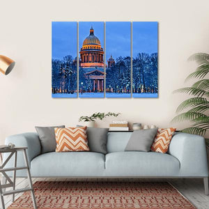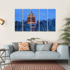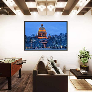 This canvas art captures St. Isaac's Cathedral in a serene winter scene. The majestic blues and whites highlight the domed building surrounded by snow-covered trees and warmly illuminated windows, bringing a tranquil atmosphere to any space.