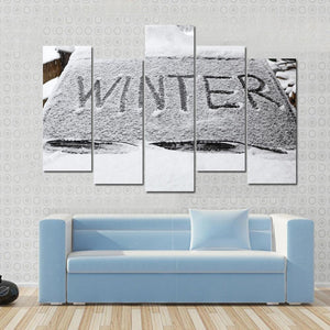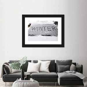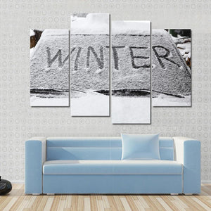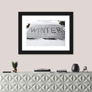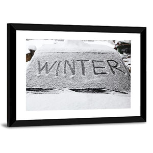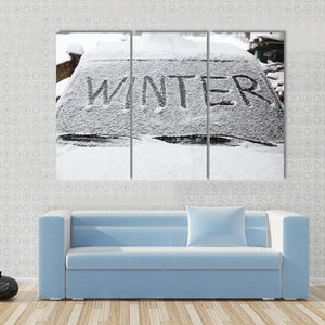 This canvas art captures the essence of winter with a minimalist design featuring the word 'WINTER' on a snowy car windshield. The cool palette of black, white, and grey evokes a crisp and stark atmosphere, perfect for creating a calm, modern look in your space.