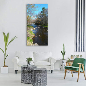 This Wisconsin River canvas shows a peaceful river scene with trees, rocks and a clear blue sky. Dark, reflective water and a green grassy bank create a calm, natural mood that suits living rooms, offices, or nature-themed spaces.